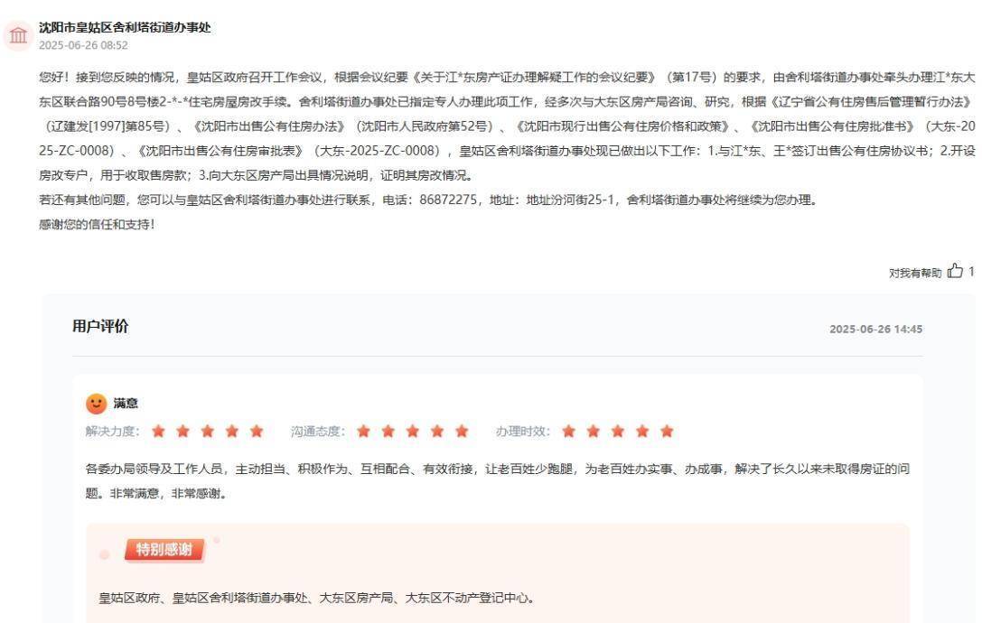 在回访中,记者了解到,由于原始收据缺失,必须找到替代性证明材料,工作组一度面临“无据可依”的困境。“我们先后30余次往返沈阳市大东区房产局、沈阳市档案局,翻阅尘封多年的房改档案,最终与大东区房产局反复核算面积、折旧率,并查阅职工人事档案,精准核定工龄折扣,确保政策衔接无误。”舍利塔街道办事处工作人员介绍道。