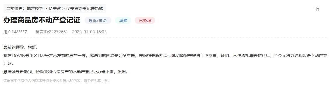 自此,办理房产证成为江先生的一块心病。2025年1月,江先生在人民网“领导留言板”上留言求助,希望相关部门协助他办理房产证。